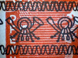Senkrechter Bogenstrich zwischen zwei auseinanderstrebenden Gliedern im unteren Zierband unter dem Posthornmundstück ( meistens 3. senkrechte Markenreihe des Bogens)